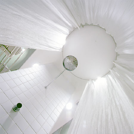 El elemento más destacado del proyecto es la elección del plástico para la resolución de la separación de espacios en la vivienda, lo que anula el sistema de tabiquería tradicional. Se ha intentado con ello singularizar la idea de espacio doméstico, huyendo de convencionalismos. Todo el plástico es blanco y ondulado, a excepción del que cierra los armarios del dormitorio y continúa formando la separación entre dormitorio y baño, que es de un color azul muy intenso, brillante y de textura lisa.