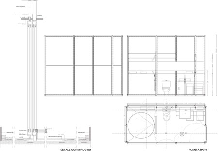 Comunicado con el dormitorio, el baño principal está definido en torno a una parte central que ocupa la bañera. De cierta inspiración en los baños grecorromanos, esta bañera se ha revestido en toro su perímetro de azulejo blanco brillante, configurando una caja de marcada geometría. Una mampara corredera, del mismo plástico blanco translúcido y ondulado, independiza la ducha y el inodoro. Las paredes y suelos se han alicatado con losetas blancas, que parecían las más adecuadas para redundar en la sencillez y continuar con el bicromatismo del blanco y el azul que reina en el resto de la vivienda. Este baño está totalmente independizado del resto de las estancias y tiene acceso únicamente desde el dormitorio, o que le dota de la necesaria privacidad. El blanco es el color dominante en todo el espacio; techo, paredes y baldosas de baños y cocina refuerzan la sobriedad marcada por el plástico y las mamparas. El color azul del mobiliario de cocina y de las puertas correderas del armario del dormitorio aportan el contraste cromático.